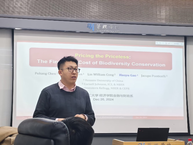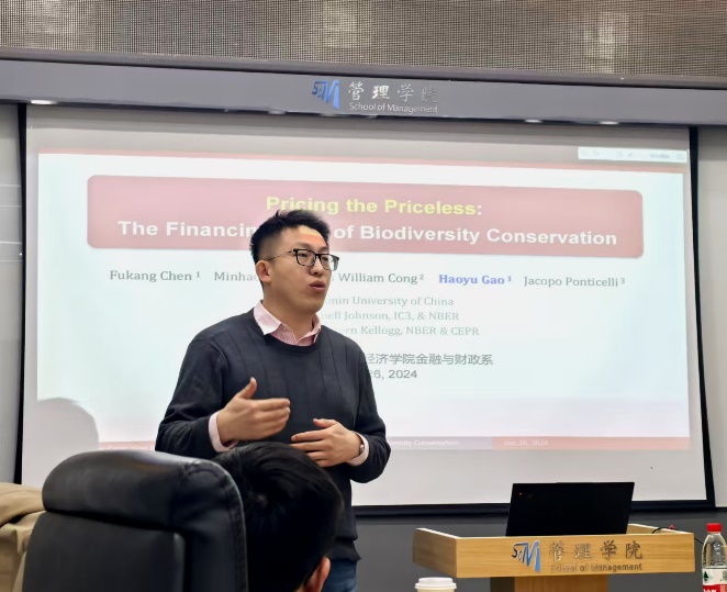 2024年12月26日上午,必威西汉姆联在中关村校区主楼317成功举办“经工讲堂”系列学术讲座。讲座邀请中国人民大学吴玉章特聘教授、财政金融学院货币金融系副主任高昊宇老师担任主讲人,主题为“Pricing the Priceless: The FinancingCost of Biodiversity Conservation”。此次讲座由必威西汉姆联金融与财政系承办,李奕助理教授主持。