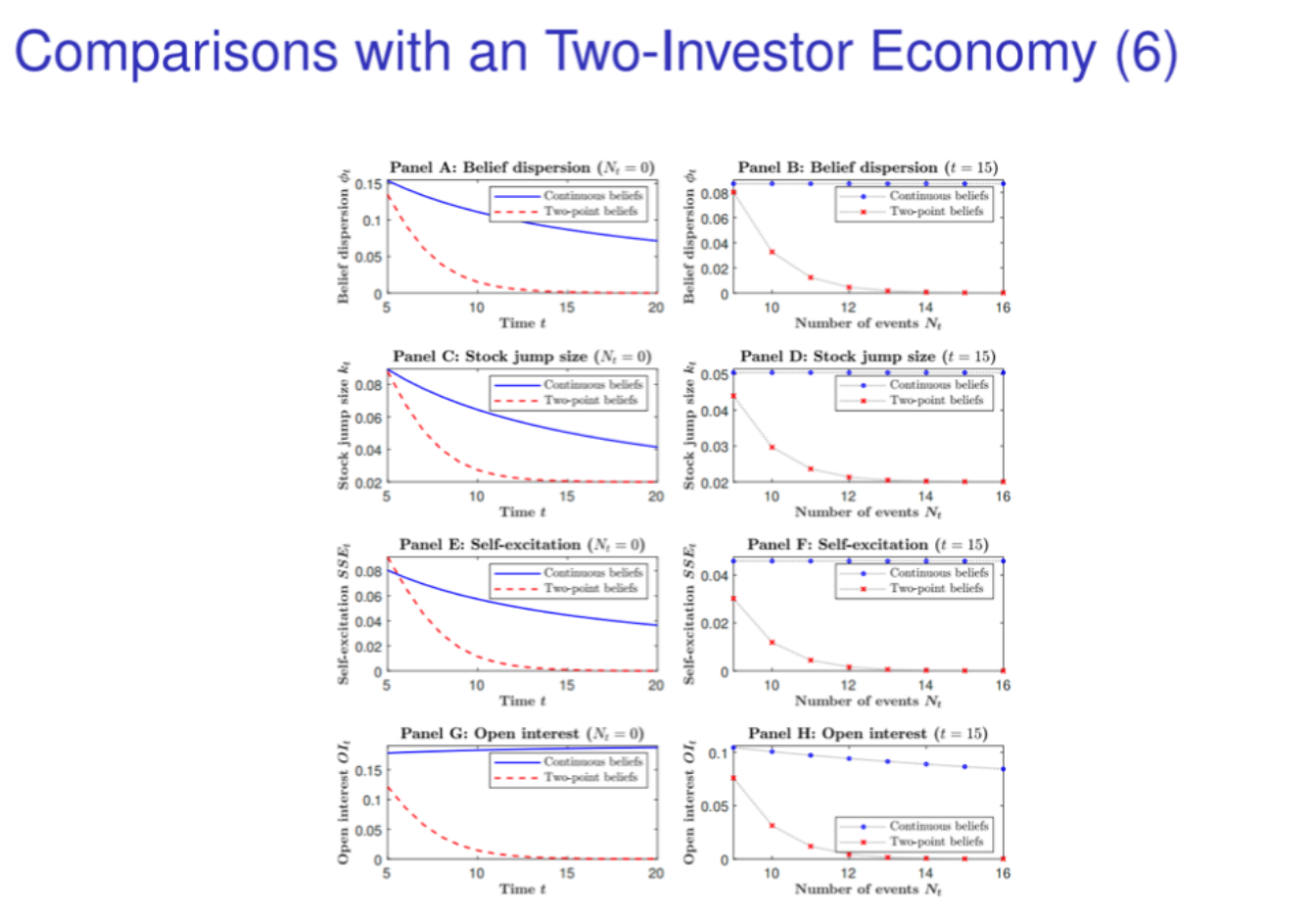 为了进一步探讨模型机制和单独的模型结果,文章还考虑了双投资者模型。只要有一个投资者掌握了所有财富,并在极好或极坏的状态下主导经济,信念分歧就会消失。因此,在双投资者经济中,主模型中的凸股价、市场动荡时的保险费增加、反周期股票溢价、期权微笑溢价以及在所有状态下都有一定规模的保险市场等结果都不再存在。
