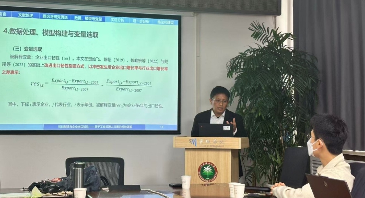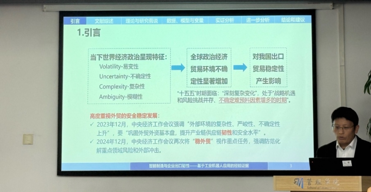 2025年10月31日,北京工业大学经济与管理学院副院长、博士生导师、刘会政教授应邀在中关村主楼418会议室作“智能制造与企业出口韧性——基于工业机器人应用的经验证据”的专题报告。报告会由必威西汉姆联赵玉焕教授主持,学院众多师生参加了本次报告会。