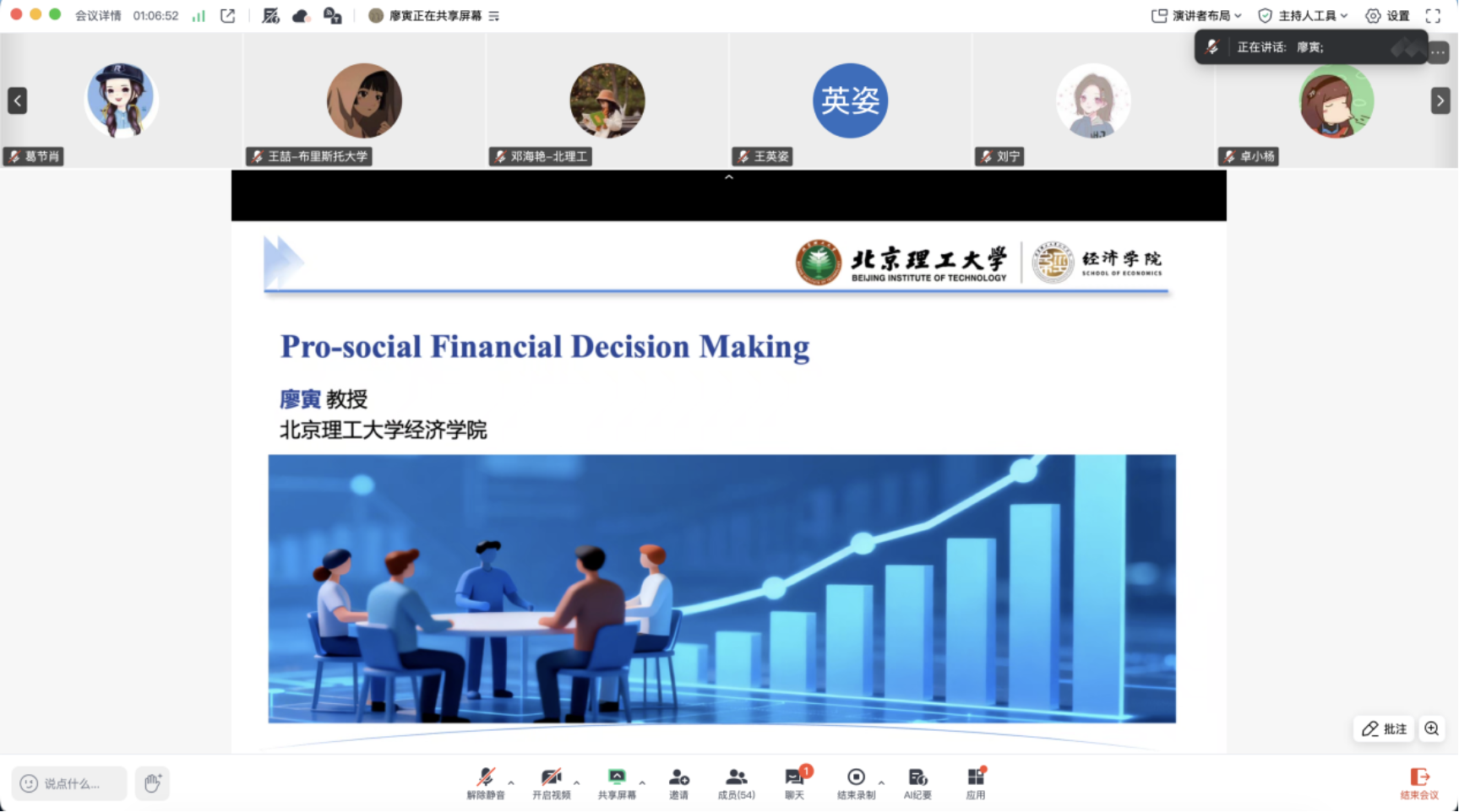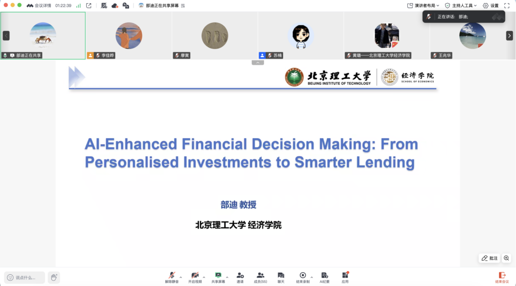 在学术分享环节,学院国家级人才代表廖寅教授和部迪教授分别围绕金融科技对于绿色金融的促进作用及人工智能增强的金融决策两大主题做了报告。与会学者与报告人展开深入探讨,现场提问踊跃、讨论热烈。
