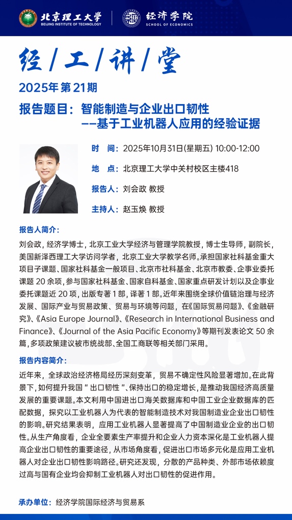 【经工讲堂2025年第21期】10-31 北京工业大学刘会政教授:智能制造与企业出口韧性——基于工业机器人应用的经验证据