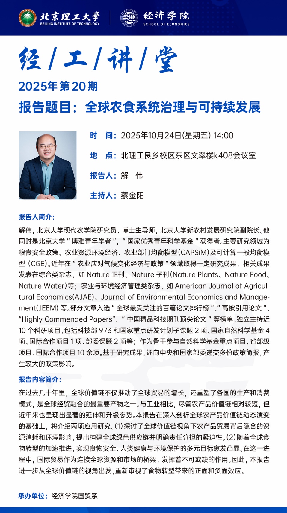 【经工讲堂2025年第20期】10-24 北京大学现代农学院解伟研究员:全球农食系统治理与可持续发展
