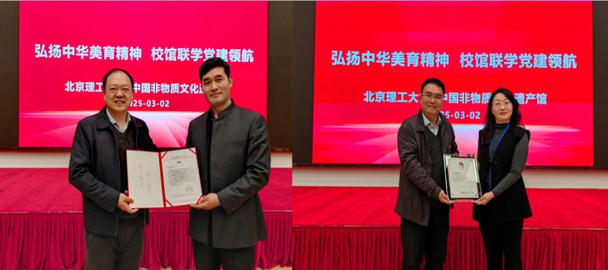 交流尾声,张瑜向贾立新交接学校感谢信暨邀请函,王晓庸向孟晓雪颁发学校百家大讲堂证书,校馆职工党员代表合影留念。王晓庸总结:再次感谢和致敬中国非遗馆,希望下一步能加强联系合作,校馆共建“走出去和请进来”相结合,邀请非遗馆来校布展,用高质量有内涵的文化内容丰富人民文化活动,提升学校整体美育浸润层级和氛围。