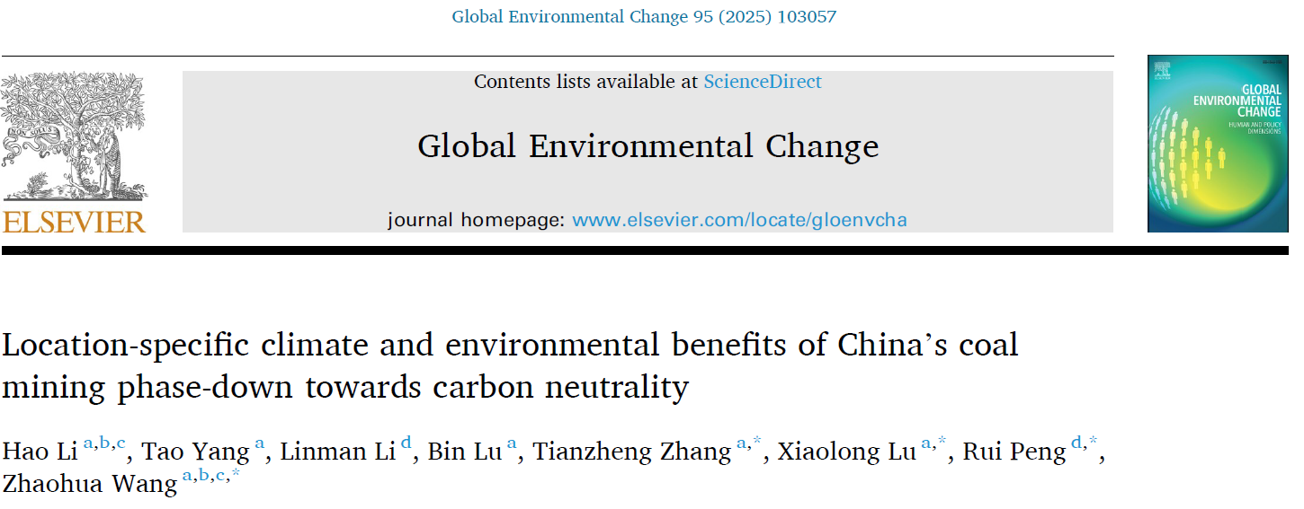 原文信息及链接:Hao Li, Tao Yang, Linman Li, Bin Lu, Tianzheng Zhang*, Xiaolong Lu*, Rui Peng*, Zhaohua Wang*. Location-specific climate and environmental benefits of China’s coal mining phase-down towards carbon neutrality. Global Environmental Change, 2025, 95: 103057.DOI: https://doi.org/10.1016/j.gloenvcha.2025.103057论文链接:https://www.sciencedirect.com/science/article/pii/S0959378025000949?dgcid=author