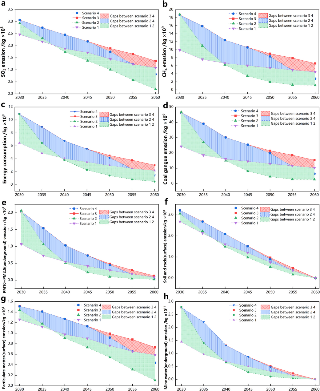 研究结果表明,通过科学的煤矿低碳转型策略可同时实现显著的温室气体减排与环境污染治理效果。预计到2060年,累计甲烷减排量可达2000余万吨,相当于减少5亿吨左右的CO₂当量;同时节能可达1200万吨标准煤,相当于瑞典2022年一次能源消费的17%左右。在环境污染物方面,二氧化硫(SO₂)、颗粒物(PM)和煤矸石排放量均可降低80%以上,矿井水减排3.8亿立方米,露天煤矿岩土排放得到有效控制。低产量情景下效益最为显著,山西、陕西、内蒙古和新疆等主产区减排潜力最大,但需根据露天矿与井工矿的差异实施分类指导策略。