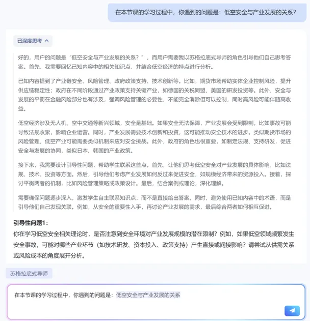 AI讲伴还能化身“苏格拉底式导师”。学生可就课堂疑问随时向“导师”提问,“导师”不直接提供答案,而是通过连续提问启发思考、拓展思路,最后进行总结提炼,有效培养学生的批判性思维与问题解决能力。