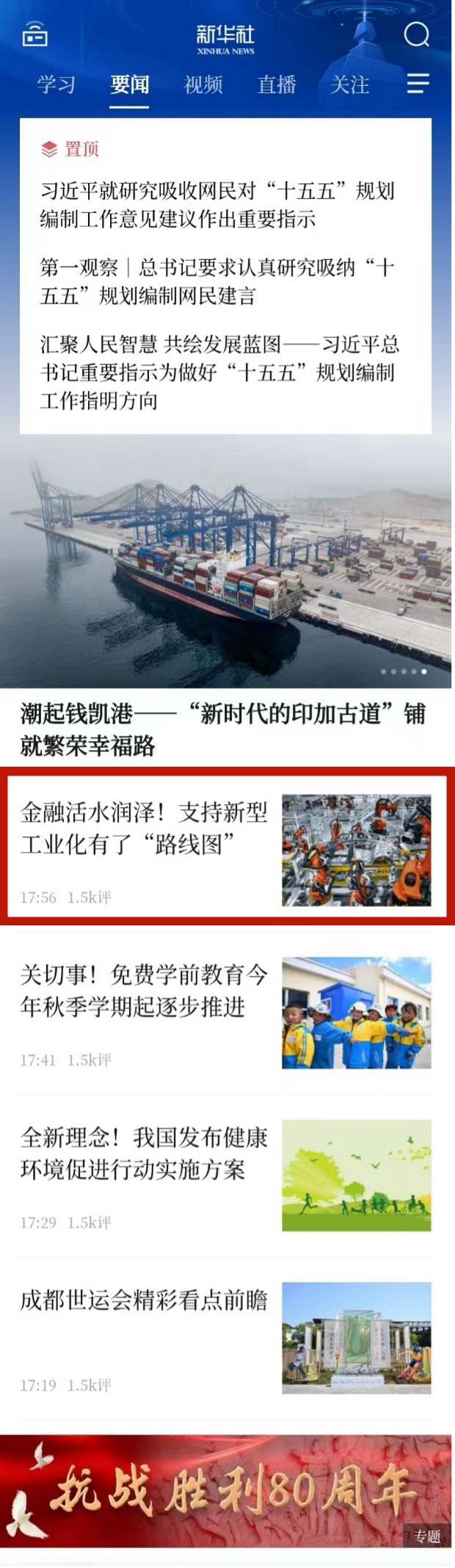 2025年8月5日,中国人民银行等7部门发布《关于金融支持新型工业化的指导意见》,聚焦新型工业化重大战略任务需要,提出18条针对性支持举措。当天我院侯成琪教授接受新华社专访,解读《关于金融支持新型工业化的指导意见》。专访《加快推进新型工业化,离不开金融活水的润泽》获得新华社客户端首屏推荐,并被中国日报网和央视网新闻频道等多家权威媒体转载。访谈全文如下。