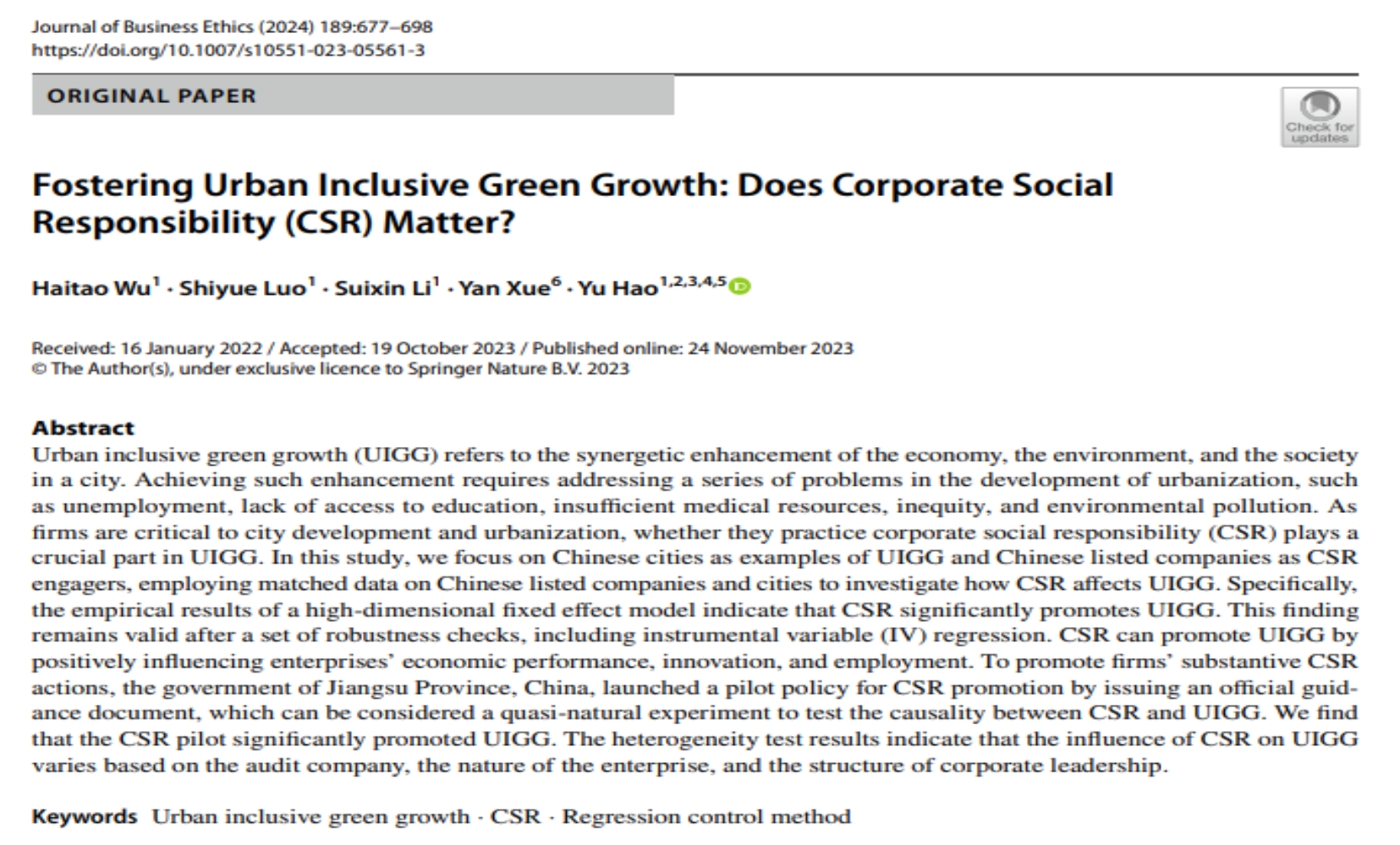 论文详情: Wu, H., Luo, S., Li, S., Xue, Y., & Hao, Y. (2024). Fostering Urban Inclusive Green Growth: Does Corporate Social Responsibility (CSR) Matter?. Journal of Business Ethics, 189(4), 677-698.