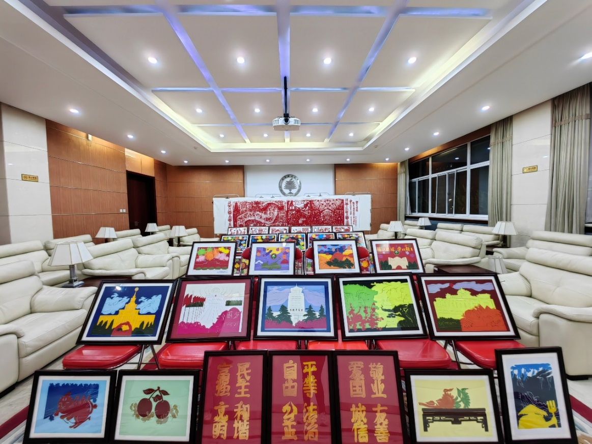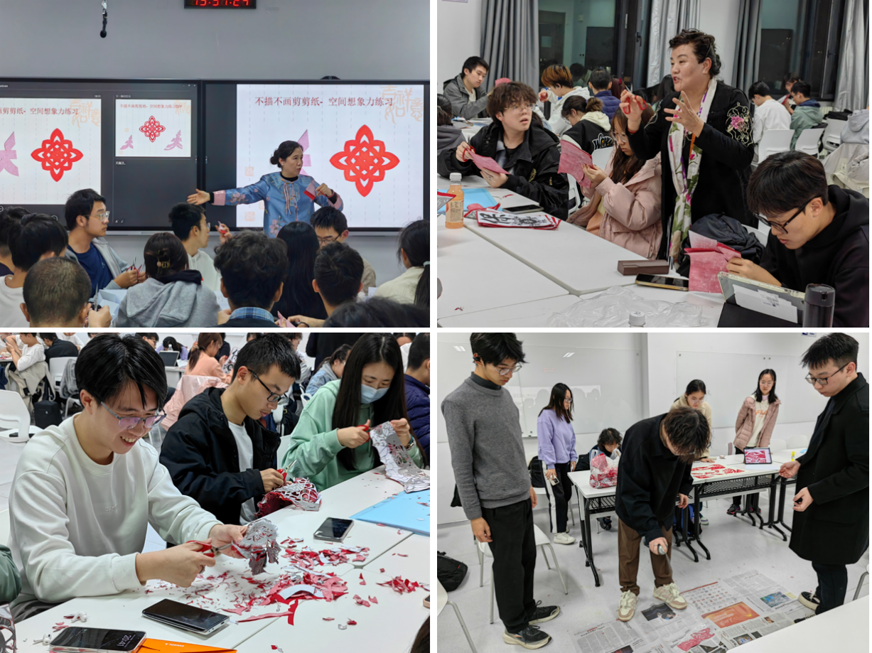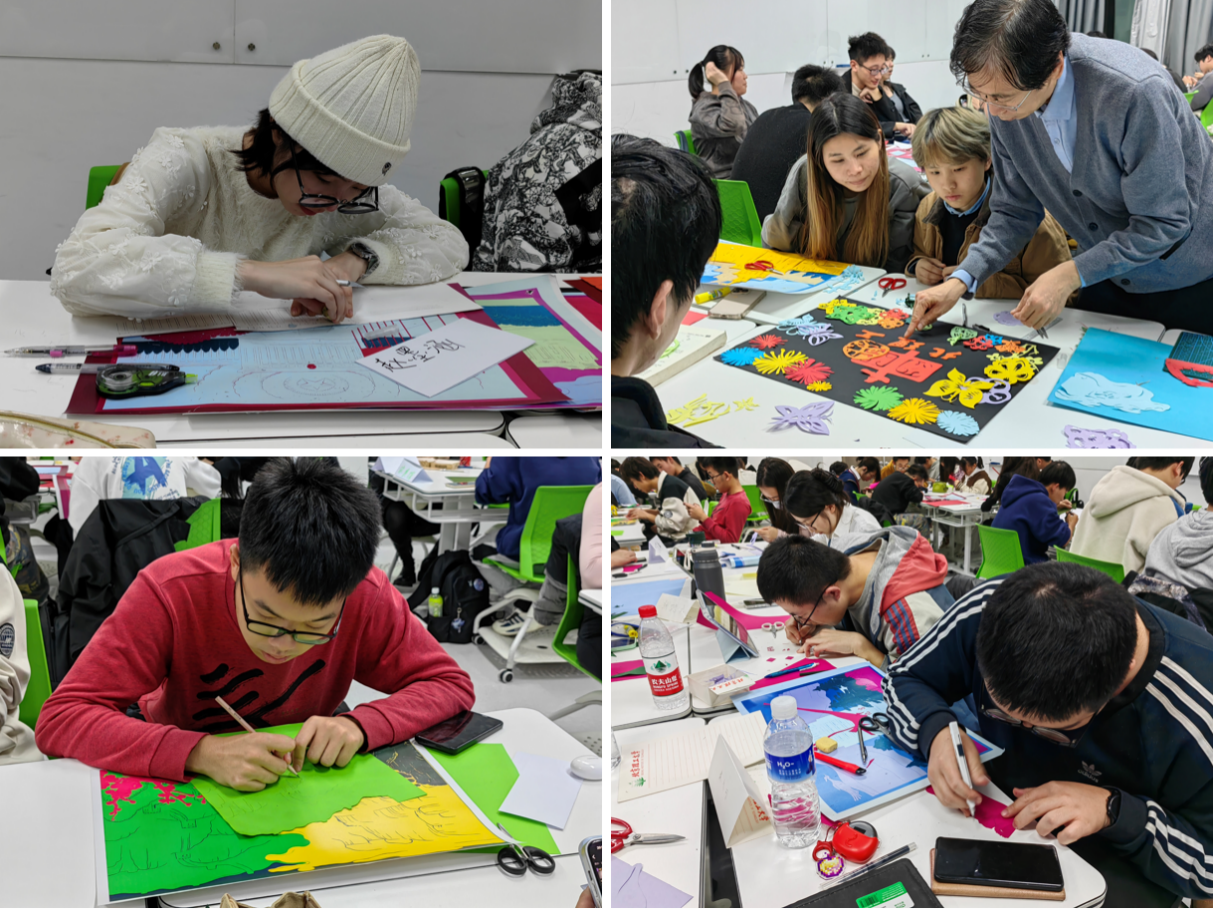 传统剪纸组,开展“延河两岸”校史大剪纸和自创主题小组剪纸两项实践。2024级应用物理专业李沫函和2022级产品设计专业高琪珺两位同学讲到:“指尖方寸见匠心,一学期专家讲座和课程实践,我们感受到浓浓家国情,加深了对学校精神的理解,感受到传统艺术的独有魅力和齐心合力共同完成作品的集体协同力,未来将把这份热爱融入学习生活中。”