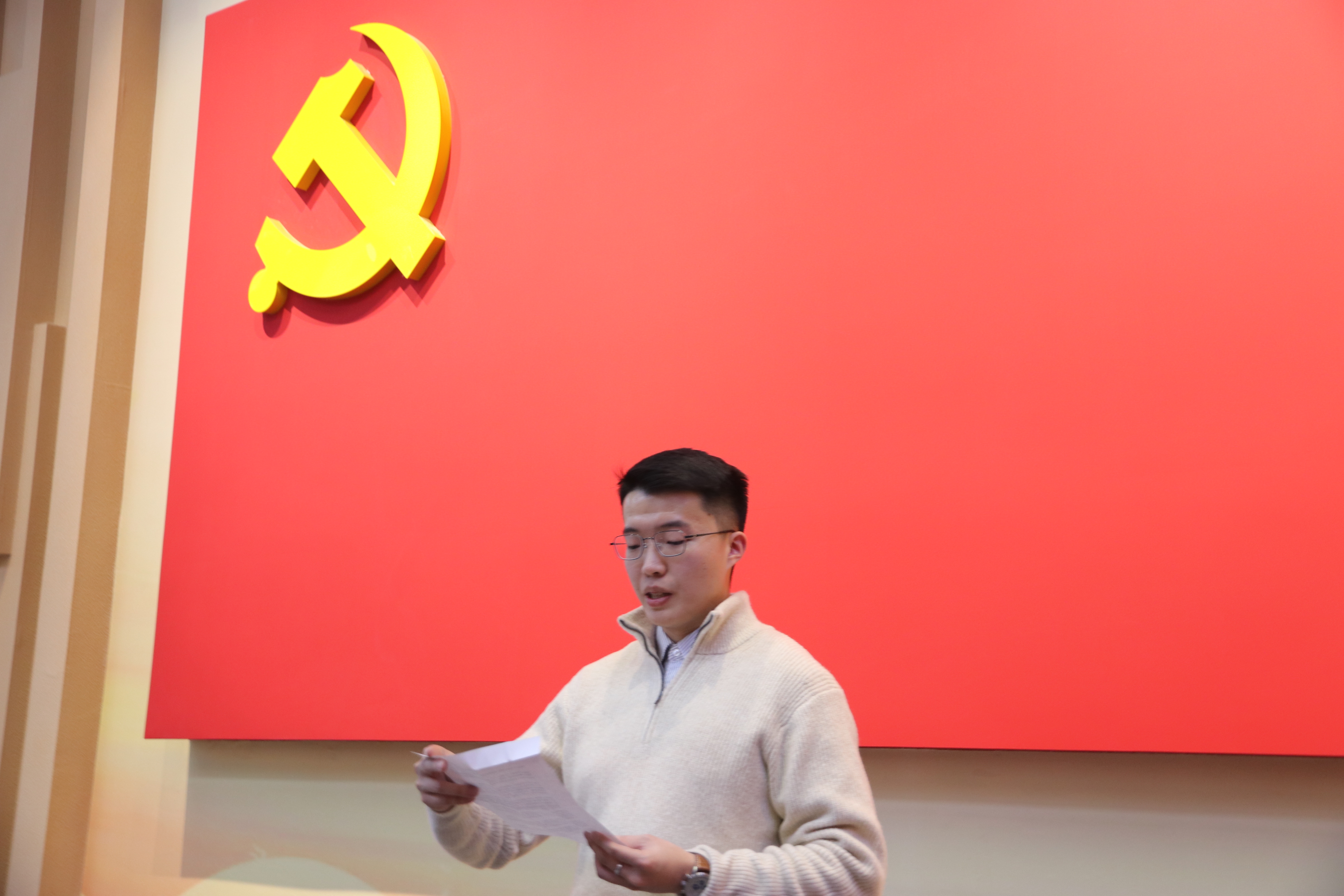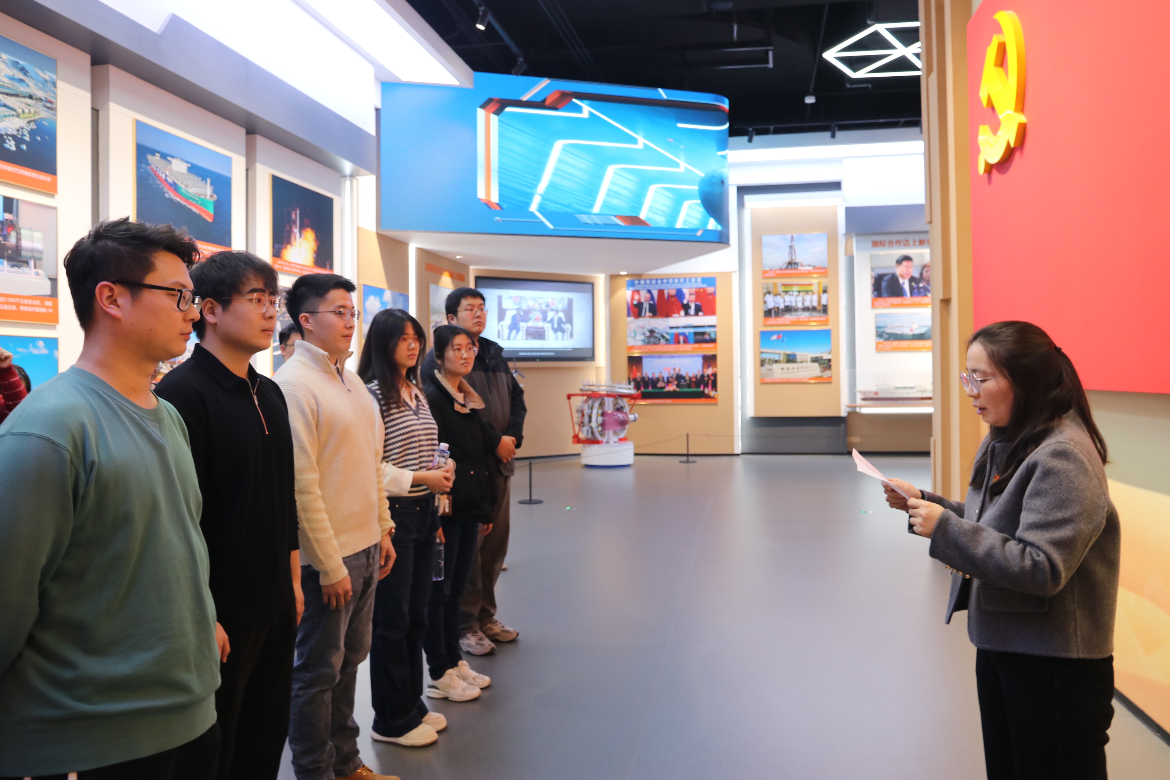 在王浩宇的带领下,新发展党员面对党旗庄严宣誓,表达了为共产主义事业奋斗终身的决心。