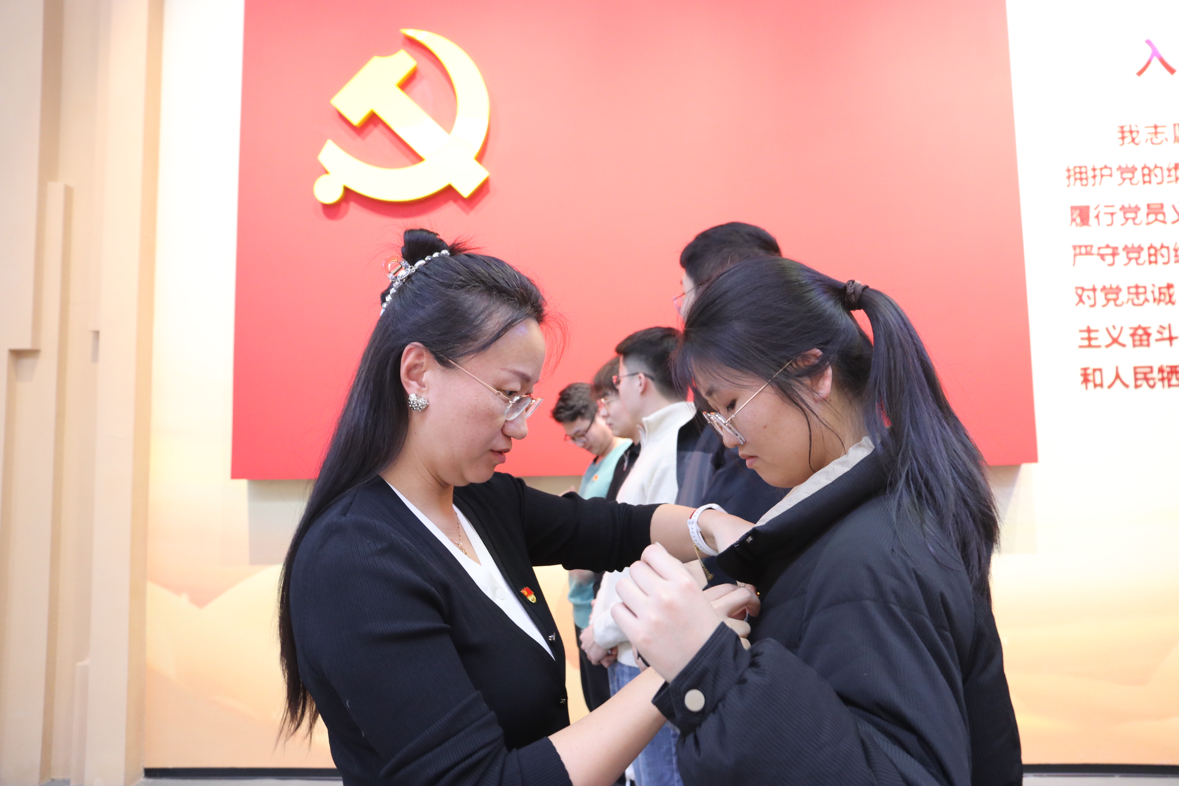 王娟宣读了《关于批准左粟民等13名同志成为中共预备党员的决定》。随后,彭明雪、王娟为新发展党员们佩戴党徽。