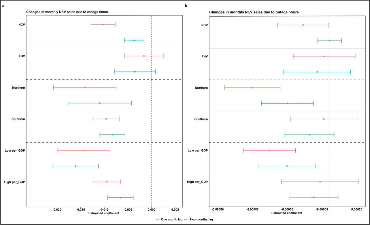 研究进一步深入分析了电力供应中断对不同类型、不同地理位置及不同经济水平地区的新能源汽车销量的影响(见图2)。结果表明,电力中断对私家车的采购产生了显著的负面影响,而对出租车和公务用车的销售影响不大。这可能是因为租赁车辆的采购决策更多地受到政策导向的影响。此外,北方城市及GDP较低的城市受到电力中断对电动汽车采购的负面影响更为严重,这可能与这些地区对电动汽车的接受程度及电力基础设施的可靠性有关。
