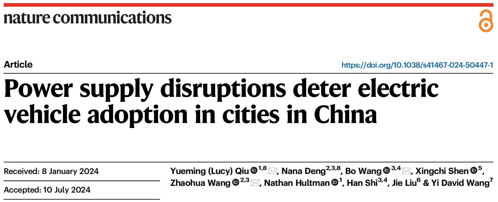 Yueming (Lucy) Qiu*, Nana Deng, Bo Wang*, Xingchi Shen, Zhaohua Wang*, Nathan Hultman, Han Shi, Jie Liu & Yi David Wang. Power supply disruptions deter electric vehicle adoption in cities in China. Nature Communications, 15, 6041 (2024).