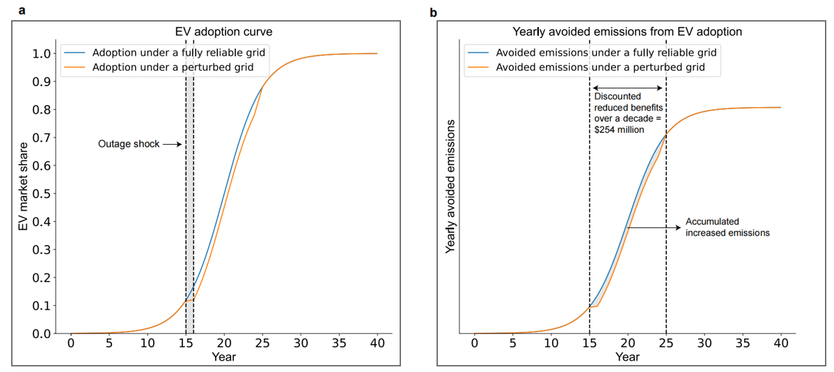 研究发现,电力系统稳定性是制约交通领域电气化的重要因素,电力供应中断显著影响了新能源汽车的推广。具体的,电力供应中断导致纯电动汽车和插电式混动动力汽车的销量(滞后1到2期)出现了明显的下降(见表1)。在此基础上,该研究进一步预测了由于电力供应中断引起的未来新能源汽车市场份额变动及其对碳减排效益的潜在影响(见图1)。